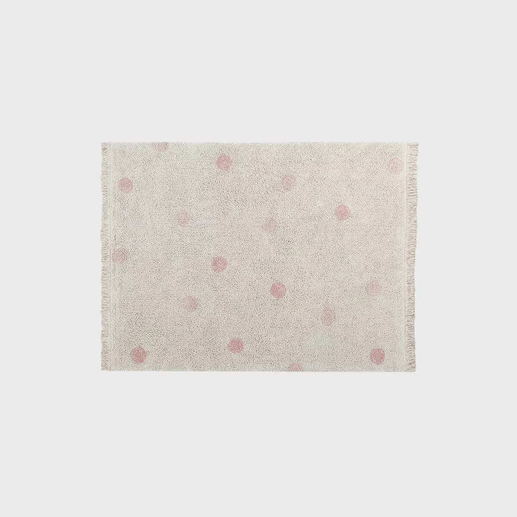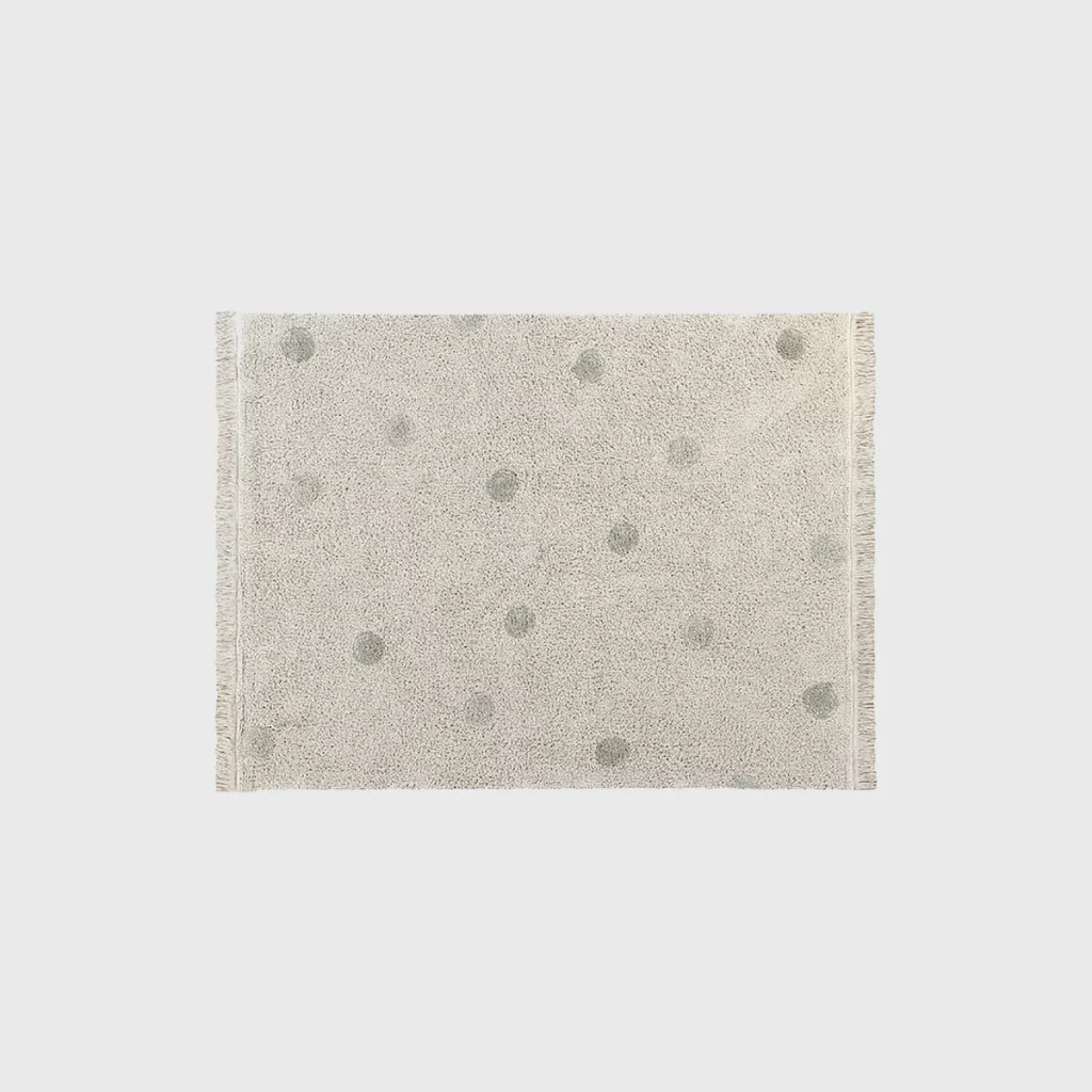 Tapete Topos, retangular com base em cinza e bolas em cor. Feito à mão. Tintas naturais. 100% algodão orgânico. Lavável em máquina.