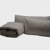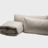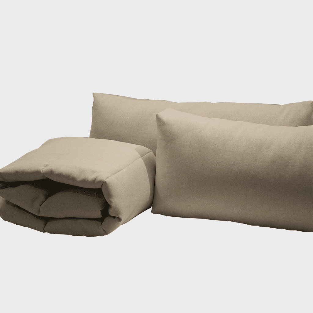 O edredom gomos se encaixa perfeitamente no colchão, criando um visual limpo, prático e aconchegante, semelhante a uma capa para colchão de encaixe (sem zíper), já pronta para uso. Ele facilita a rotina, já que não é preciso forrar ou dobrar diariamente. Os almofadões dão o toque final de conforto e acolhimento, e também funcionam como encosto para o uso da cama como sofá.