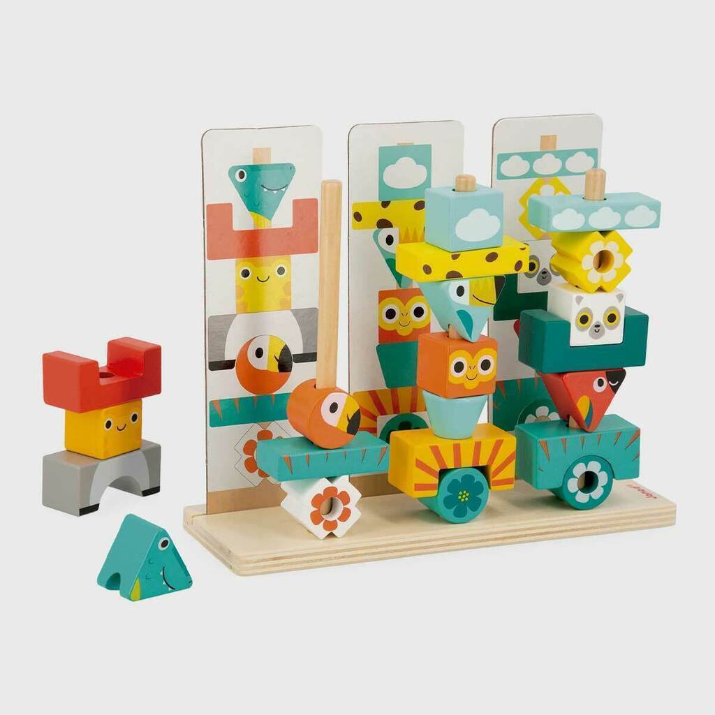 Aqui está um magnífico jogo de observação e reflexão em madeira para crianças a partir dos 3 anos! Um jogo educativo em que a concentração é fundamental! O princípio é simples: recriar os modelos indicados nos 6 cartões frente e verso impressos nos 3 postes de madeira, utilizando os 52 elementos incluídos. As peças vêm em todos os tipos, formatos e cores! Você terá que encontrar o caminho certo e colocá-lo da maneira certa. E porque não dar asas à imaginação e criar totens cada vez mais originais? As crianças também vão adorar encontrar os animais da selva - por exemplo, um macaco, um papagaio ou mesmo um crocodilo - escondidos nas estampas coloridas.